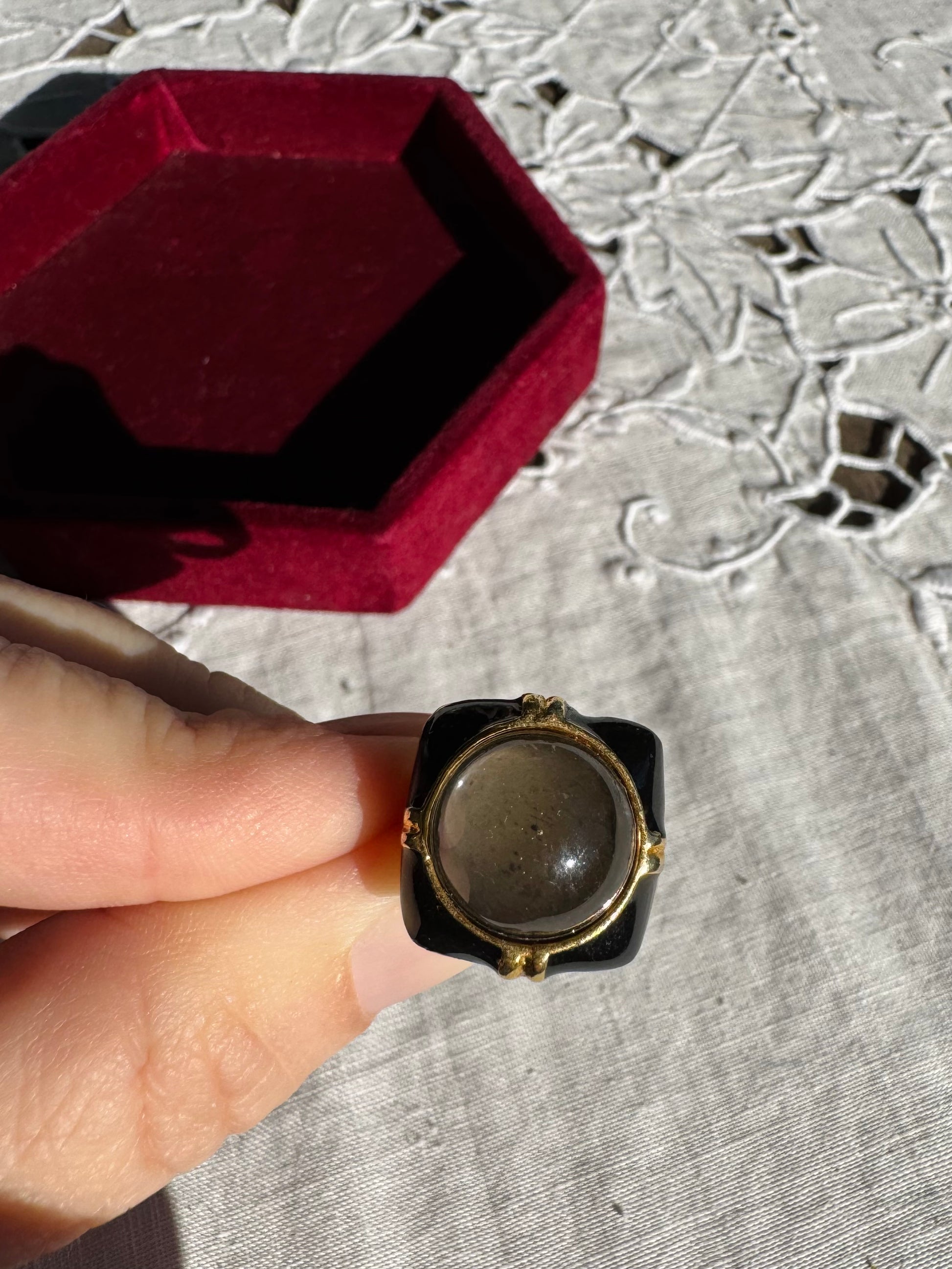 This authentic and perfect working mood ring dates from the 1960s. A large cabochon mood stone sits securely in a gold toned and black enamel ring. The color changes quickly with the warmth of your hand, magically revealing your true mood!