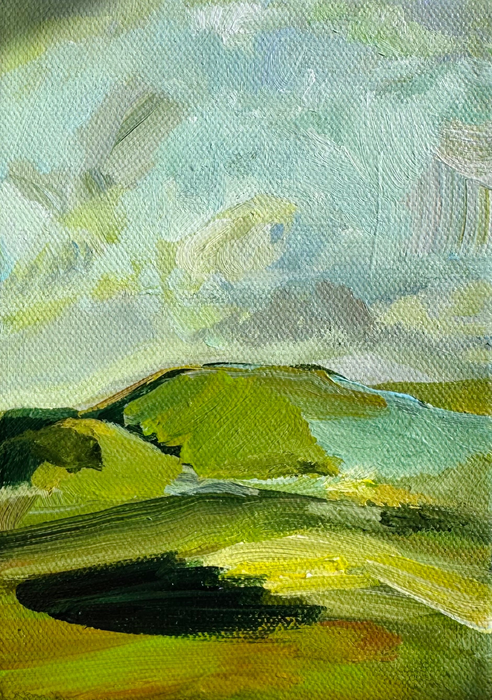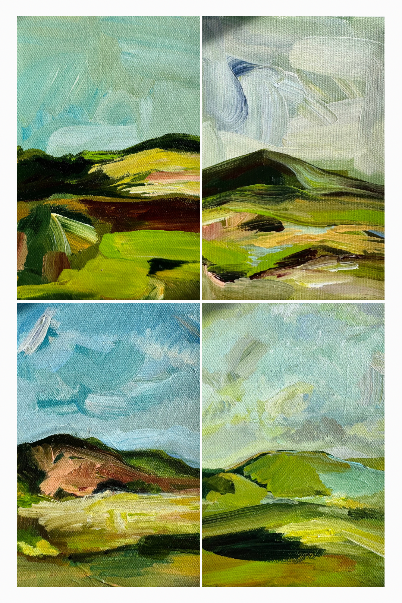 I spent part of July in Italy, wildly inspired by the rolling expanse of Tuscany. These small canvases depict the lush landscapes, vibrant earthy color palettes and the sense of an Italian summer as seen through the window of a moving train or vehicle.